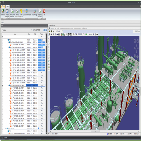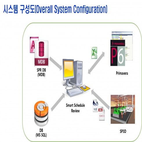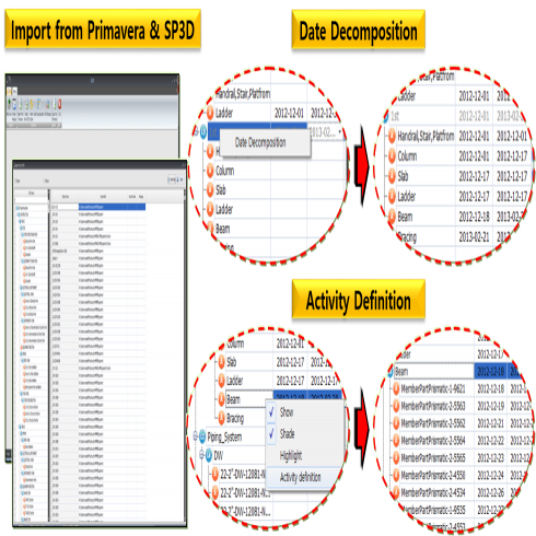 3D 객체(SP 3D)와 WBS(Primavera)을 결합한 3D 모델을 생성하여 시뮬레이션하고 관리하는 시스템으로 WBS 정보인 Primavera의 Activity 정보와 SmartPlant 3D 시스템 구조를 활용하여 3D + Primavera 데이터 연계 후, 검토에 필요한 Data를 연계 및 활용하고 검토된 정보는 Primavera로 다시 전송한다.