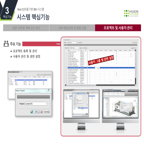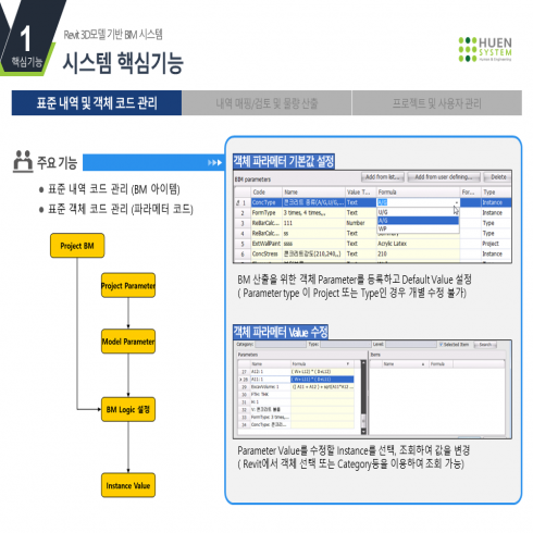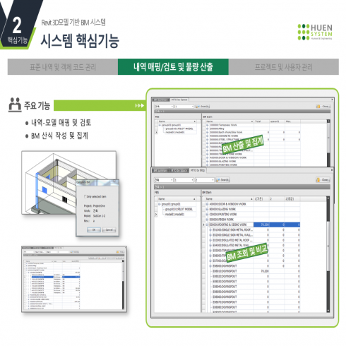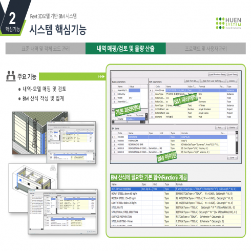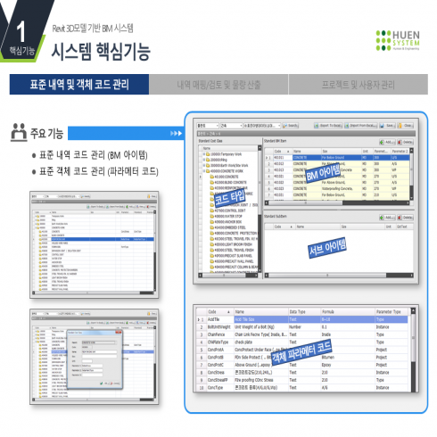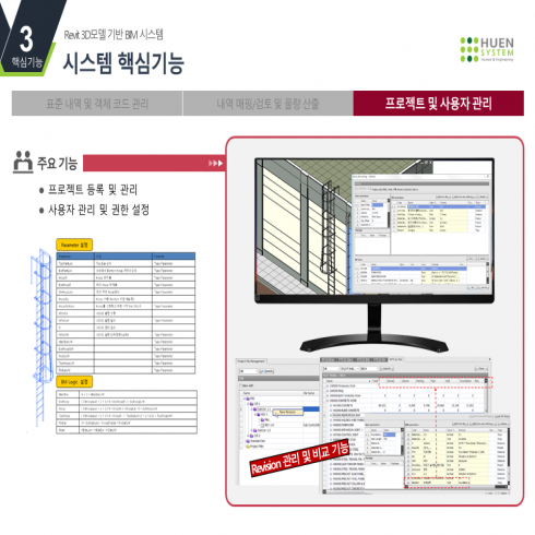 Autodesk사의 건축 모델링 프로그램인 Revit기반의 BIM 시스템. Revit에서 Family기반의 모델링을 이용한 BM 자동 산출 및 통합관리 시스템으로서 협력사 및 관련 부서에서 통합적으로 사용할 수 있도록 구성되어 있다. Model은 Tekla 및 PDS와 편리하게 전환할 수 있도록 기능이 되어 있어 업무 단계별 불필요한 모델링작업도 최소화 할 수 있다.