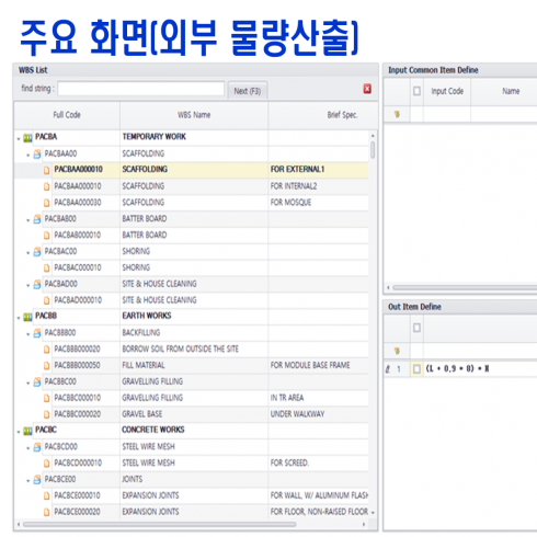 플랜트 건축 입찰 물량 산출 시스템으로 빠르고 정확한 물량산출, 물량 비교검증, 축적 데이터를 활용한 개략 물량산출을 제공하다. 이를 활용하여 다양하고 복잡해지는 입찰 업무에 신속하고 정확한 대응으로 입찰 경쟁력을 확보한다.